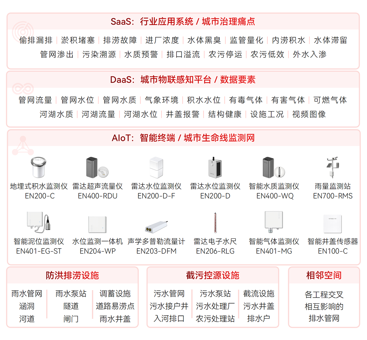 對排水設(shè)施(雨污水管網(wǎng)、窨井蓋、截流泵站、提升泵站、抽水泵站、農(nóng)村污水處理站、溢流井、排水井、污水處理廠、調(diào)蓄設(shè)施等)關(guān)鍵節(jié)點、易澇積水點,河湖水位、流速,管網(wǎng)液位、流速、水質(zhì),內(nèi)澇積水等指標進行實時數(shù)據(jù)監(jiān)測,形成設(shè)施完整、拓撲清晰、位置準確的排水設(shè)施“一張圖”,為排水空間規(guī)劃、設(shè)計、排水設(shè)施改造提供決策支持。